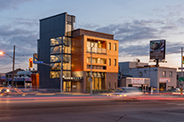 A mixed use development converting and expanding a 1950's former bank building into a design studio with residential condo living intertwined, complete with a green rooftop patio.